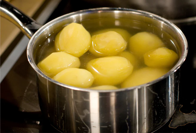 Zuerst die Kartoffeln abbürsten und in einem Topf mit Wasser bedeckt 30 Minuten garen. Anschließend abgießen, mit kaltem Wasser abschrecken und schälen. Die Kartoffeln noch warm in Scheiben schneiden.